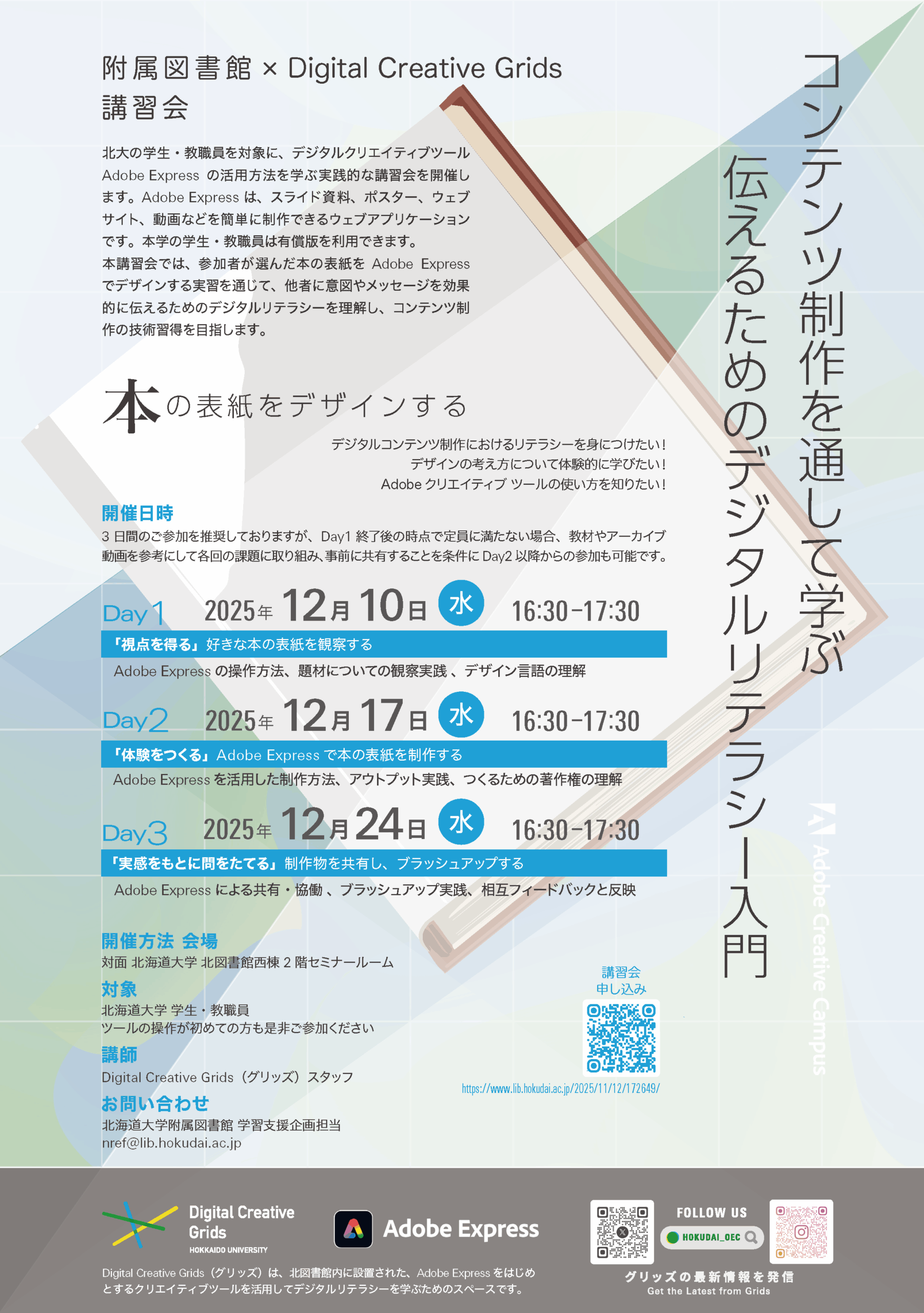 本講習会では、参加者が選んだ本の表紙を Adobe Expressで「リ・デザイン」(再構築)する全3回の実習を通じて、他者に意図やメッセージを効果的に伝えるためのデジタルリテラシーを理解し、コンテンツ制作の技術習得を目指します。