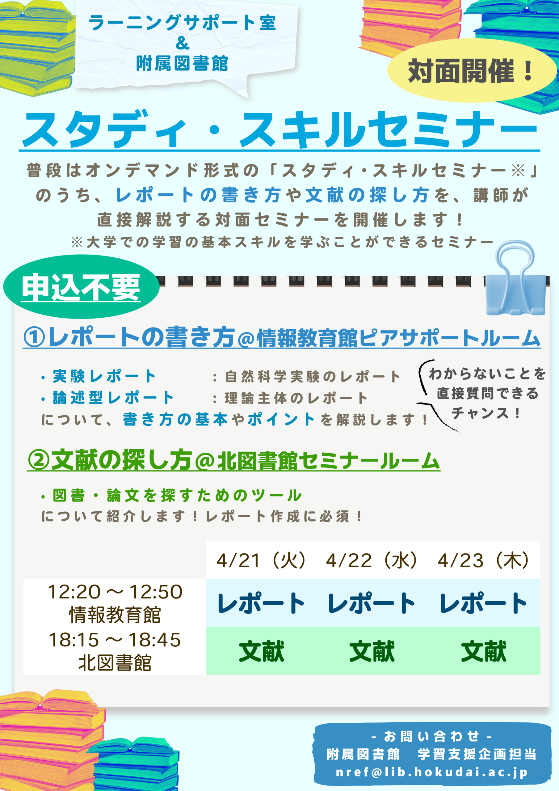 | 日時・会場 | ●レポートの書き方 日時:2026年4月21日(火)、22日(水)、23日(木) 時間:12:20-12:50 会場:情報教育館2階ピアサポートルーム ●文献の探し方 |
