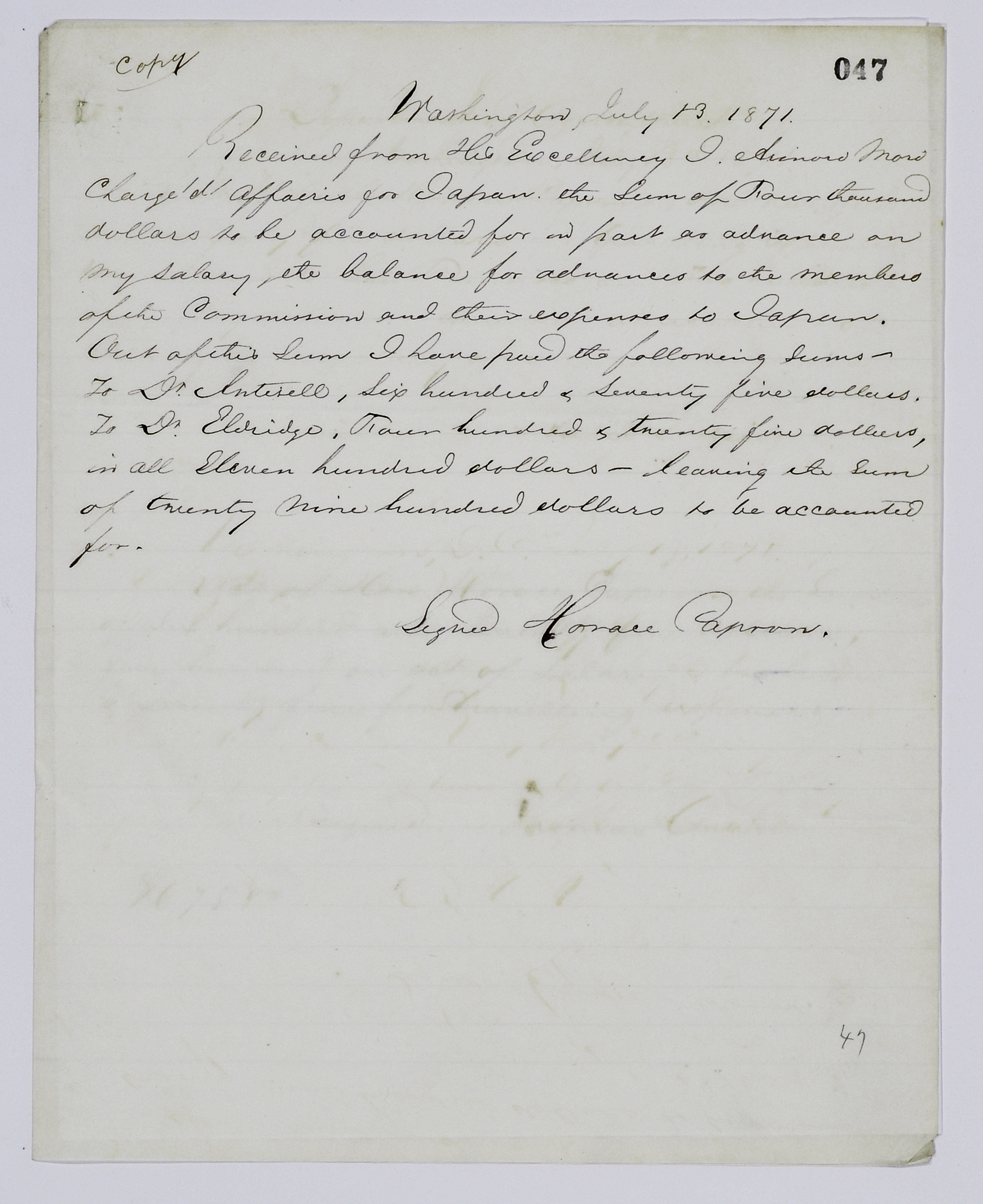 開拓使御雇外国人たちの日本赴任旅費および給料の1部として4,000ドル受領書(写) ( 1 / 1 ページ)